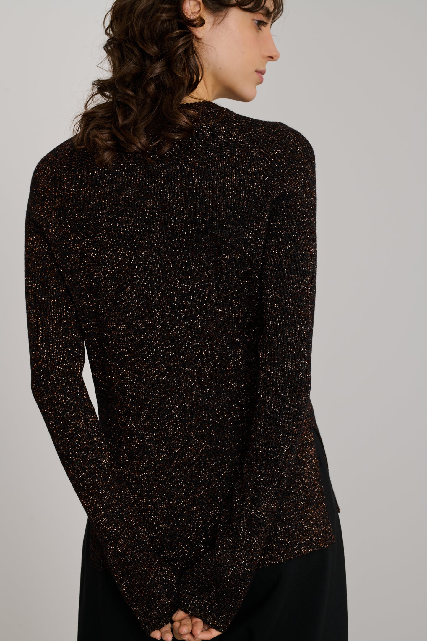 VERONA is a ribbed jumper knitted from merino wool yarn, mixed with lurex for an iridescent effect. It has a straight, close-fitting cut and a round neckline.