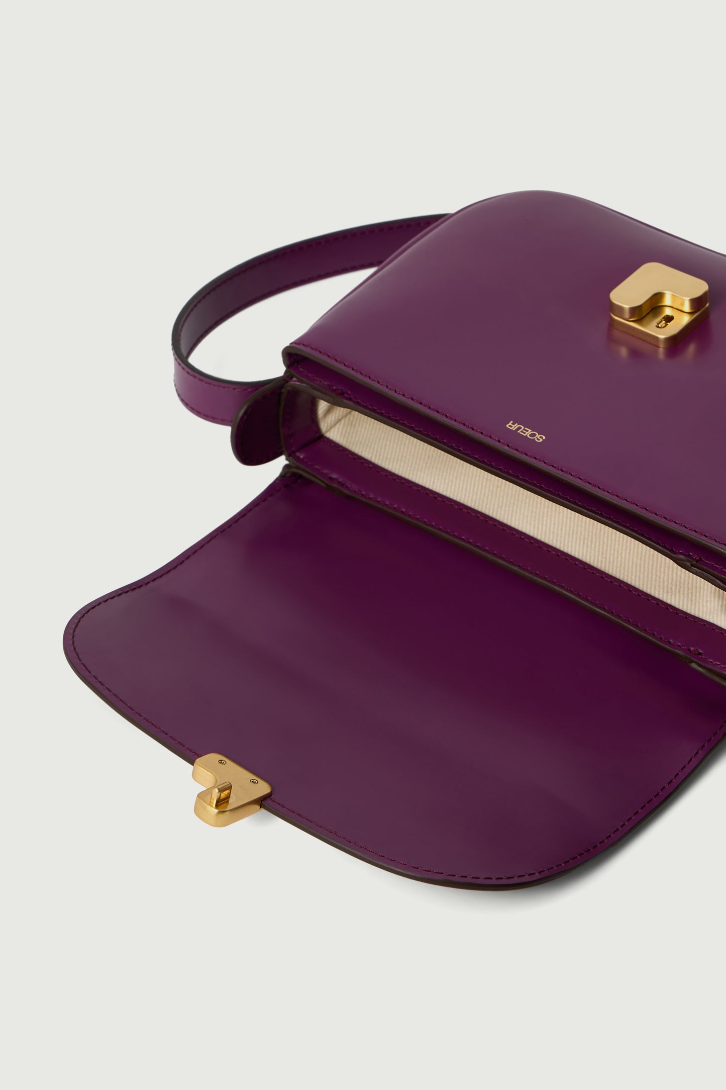 - Large front flap with golden "S" monogrammed clasp